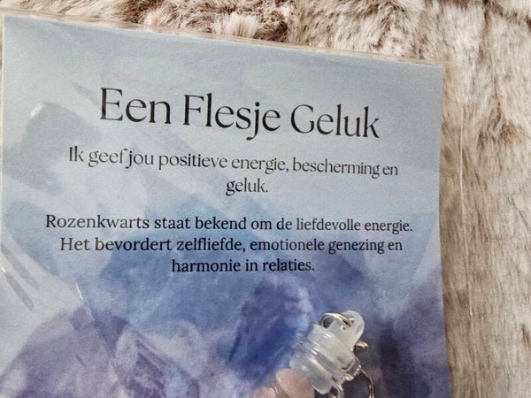Een prachtig glazen flesje van 4 cm, gevuld met echte rozenkwarts steentjes. Het flesje wordt geleverd in een stijlvol verzendzakje, inclusief een korte uitleg over de betekenis van deze bijzondere steen.